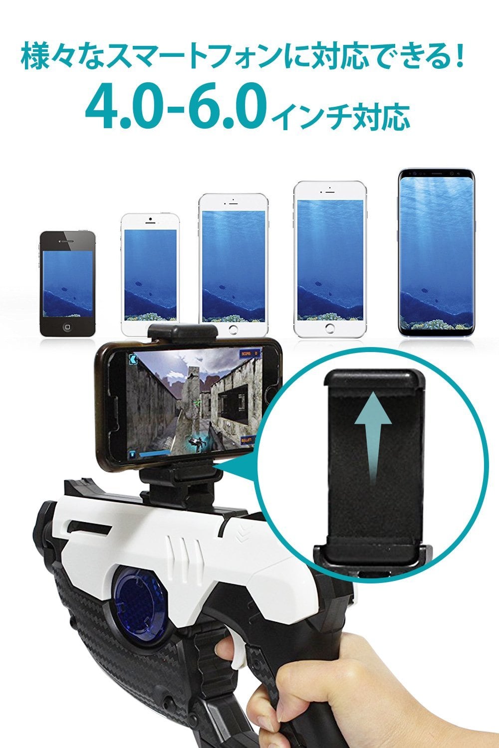 銃型コントローラーにスマートフォンをセットして、コントローラーとスマホをBluetoothで接続し、Android/iOS用アプリ「AR-Gun」をインストールして戦闘機ゲームやUFOクレー射撃などを楽しむことができます。